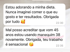 ➢ Você emagrecerá de forma tranquila, personalizada e sem precisar mudar drasticamente sua rotina. Nada de passar fome ou se sujeitar a dietas mirabolantes. Aqui, trabalhamos juntas para encontrar os melhores alimentos que se adequam ao seu gosto e estilo de vida.